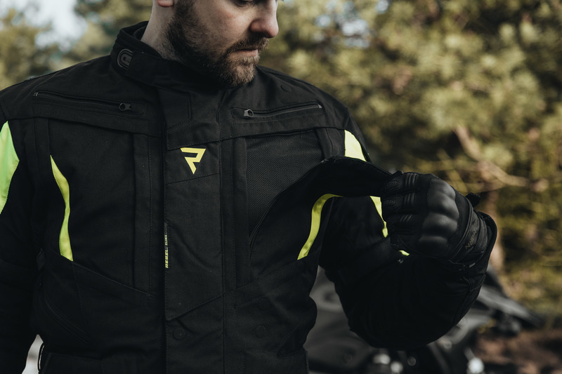 O Twoje bezpieczeństwo dbają: komplet ochraniaczy (barki, łokcie, plecy), wzmocnienia newralgicznych stref z materiału Hitena® Dobby Ballistic oraz odblaskowe wstawki i wymienne panele fluo.