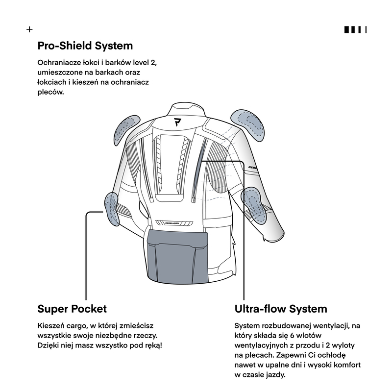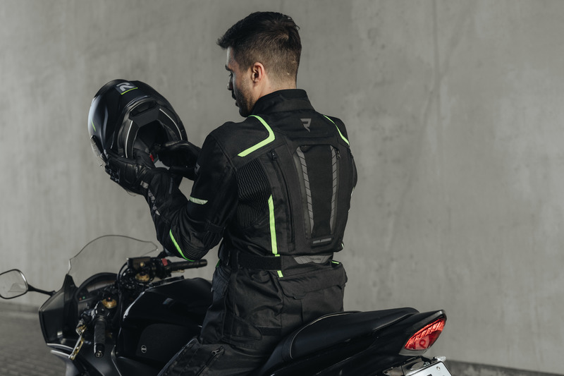 O Twoje bezpieczeństwo dbają ochraniacze łokci i barków CE-level 2, odblaskowe wstawki i duży panel fluo na plecach. Podwójne i potrójne szwy zwiększają dodatkowo wytrzymałość kurtki na przetarcia.