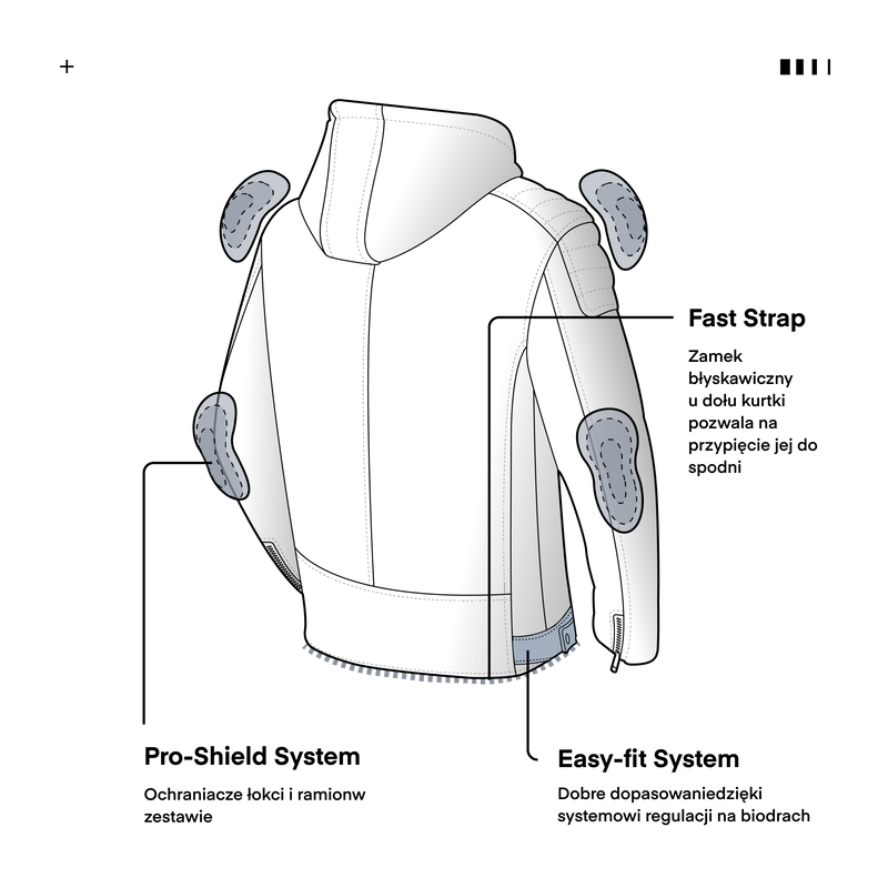 Bezpieczeństwo zapewniają m.in. certyfikowane ochraniacze łokci i barków oraz szwy zwiększające wytrzymałość materiału.