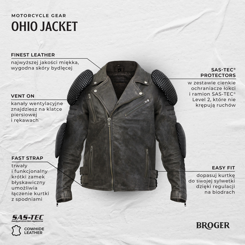 Kurtka skórzana Broger Ohio to model, który idealnie sprawdzi się na motocyklu, ale też do noszenia na co dzień. Została uszyta z najwyższej jakości skóry bydlęcej, a o dobrą wentylację dbają dwa wloty w przedniej części kurtki..