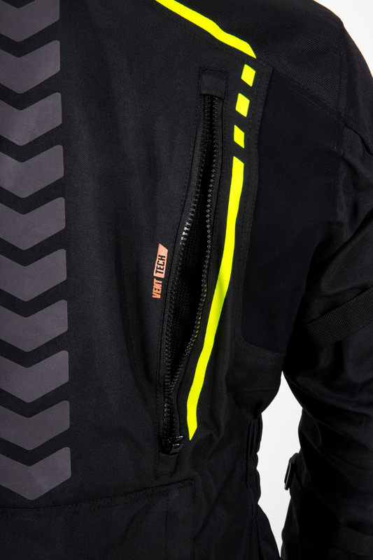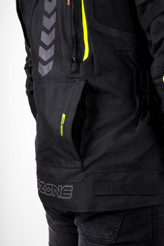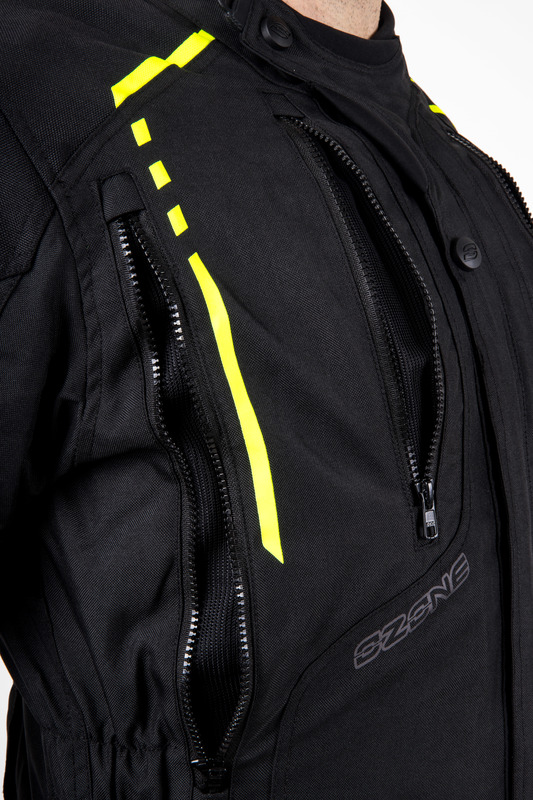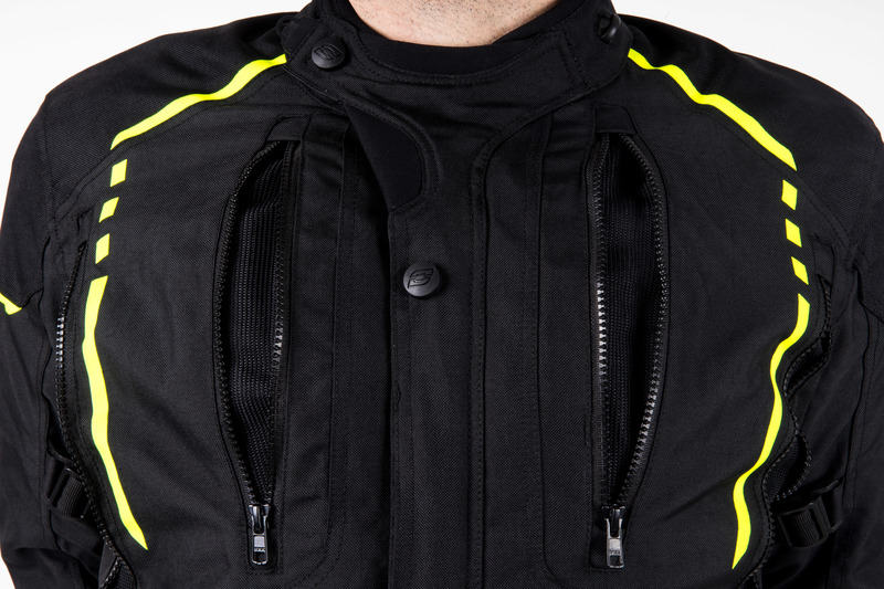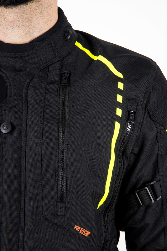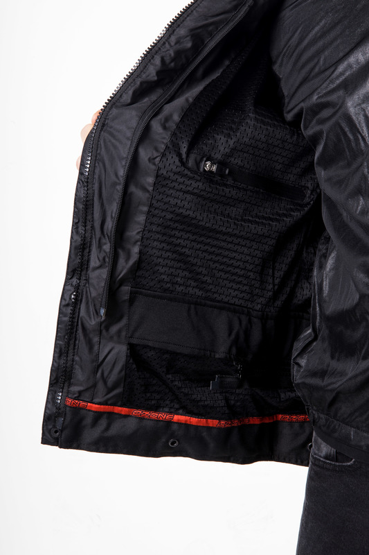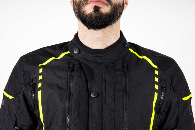 Turystyczna kurtka motocyklowa wyposażona w wypinaną wodoodporną membranę. Ma protektory CE Level 1 na barkach i łokciach oraz kieszeń na protektor na plecach. Świetną wymianę powietrza zapewnia sześć kanałów wentylacyjnych – cztery z przodu oraz dwa z tyłu. MATERIAŁ