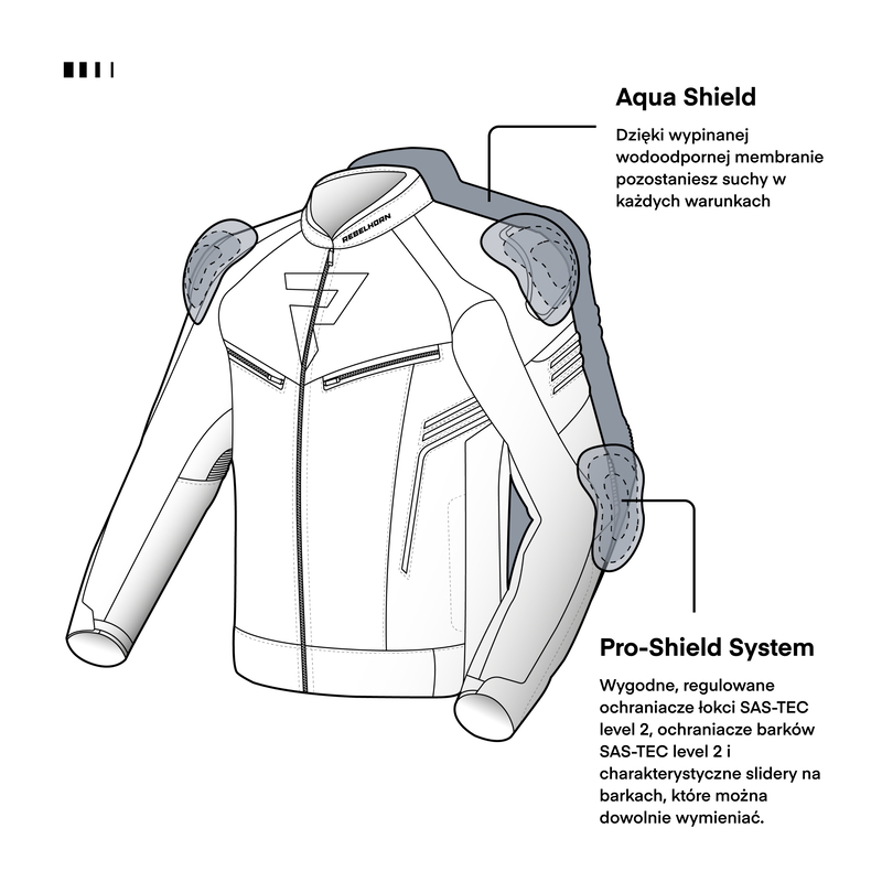 W kurtce tekstylnej Rebelhorn Vandal zastosowano certyfikowane ochraniacze łokci i barków oraz wymienne slidery, które znacząco zwiększają bezpieczeństwo.