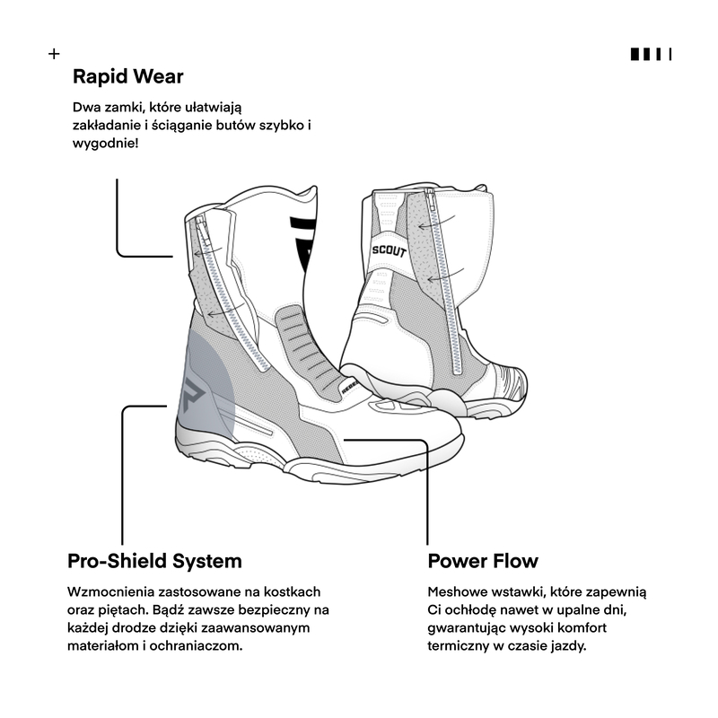 Turystyczne buty motocyklowe Rebelhorn Scout Air to propozycja na letnie wypady i wyjazdy w ciepłe rejony. Podszewka 3D mesh doskonale radzi sobie z odprowadzaniem wilgoci, a antybakteryjna wkładka zapewnia świeżość. Zapewniają ochronę stopy dzięki zastosowaniu ochraniaczy SAS-TEC® oraz wzmocnieniom na pięcie i czubku buta.