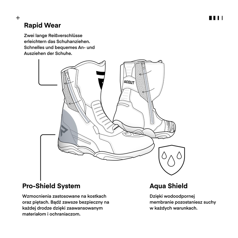 Turystyczne buty motocyklowe Rebelhorn Scout zapewniają ochronę stopy dzięki zastosowaniu ochraniaczy SAS-TEC® oraz wzmocnieniom na pięcie i czubku buta. Rebelhorn Scout mają wodoodporną membranę Hipora®, która zapewnia zarówno oddychalność, jak i nieprzemakalność.