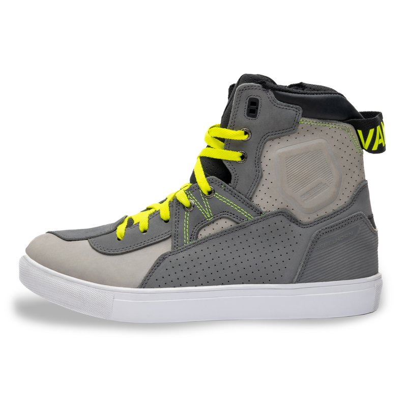 Buty motocyklowe Rebelhorn Vandal zostały uszyte ze skóry bydlęcej. Dobrą wentylację zapewniają perforowane panele i podszewka 3D mesh. Buty mają wzmocnioną podeszwę, twarde osłony pięt i kostek. Długi zamek z boku ułatwia ich zakładanie. Kolorystyka butów motocyklowych Vandal nawiązuje do kurtek Rebelhorn o tej samej nazwie.