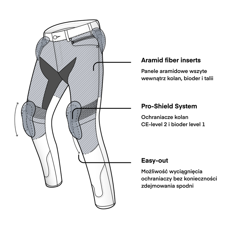 O Twoje bezpieczeństwo dbają: ochraniacze SAS-TEC® (biodra, kolana) oraz panele na kolanach, biodrach i w pasie wykonane z wytrzymałego aramidu, sięgające aż do połowy piszczeli.