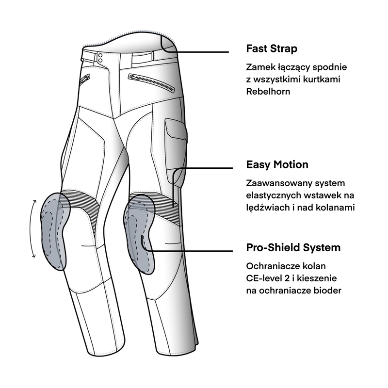 • zamki łączące typu 8VST (360° oraz krótki), dzięki którym  zepniesz spodnie z dowolną kurtką Rebelhorn