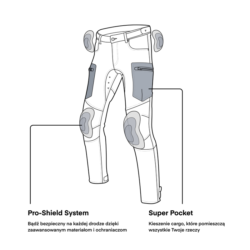 O Twoje bezpieczeństwo dbają: ochraniacze SAS-TEC (biodra, kolana) oraz panele na kolanach, biodrach i w pasie wykonane z wytrzymałego aramidu.