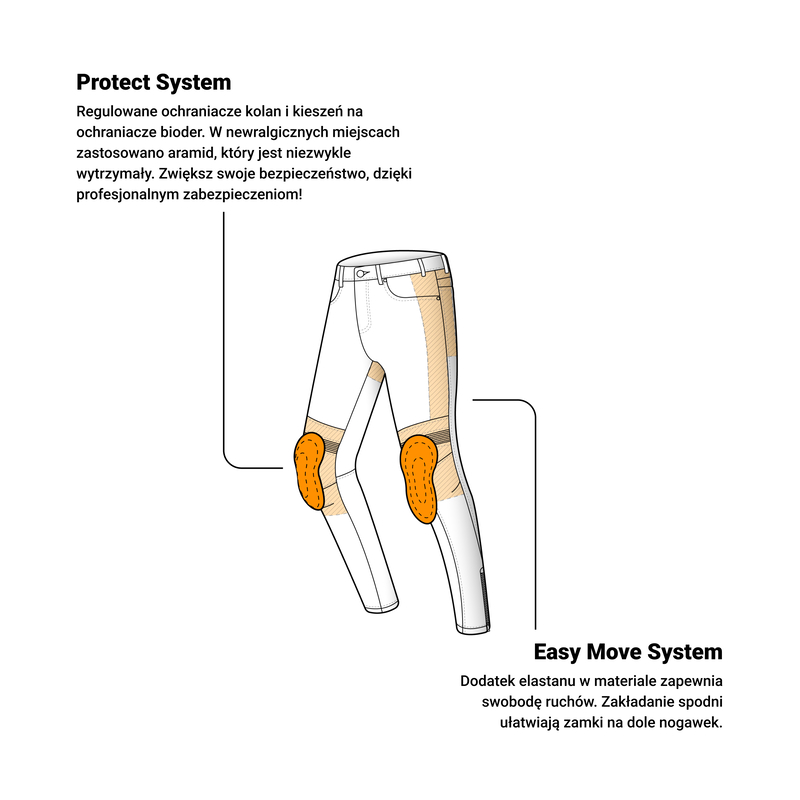 • Możliwość wyciągnięcia ochraniaczy bez konieczności zdejmowania spodni ułatwia używanie ich na co dzień