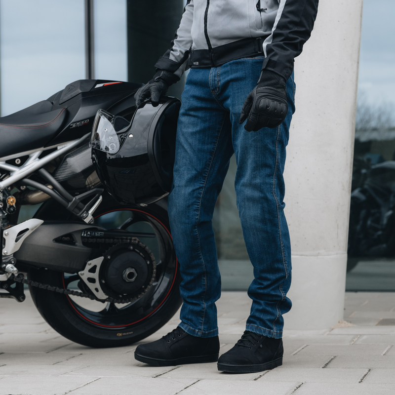 Jeansy motocyklowe Ozone Striker są dostępne w dwóch wariantach kroju – slimfit i regular – dzięki czemu pasują do wielu typów sylwetki. Dodatek elastanu zapewnia z kolei swobodę ruchów. Dzięki klasycznemu krojowi dobrze wyglądają z miejskimi kurtkami motocyklowymi – zarówno tekstylnymi, jak i skórzanymi. Bezpieczeńsatwo zapewniają ochraniacze kolan Flying Bats CE-level 2 i aramidowa podszewka sięgająca do połowy łydki. Jeansy Ozone Striker są więc trwałe, bezpieczne i odrobinę rozciągliwe, co poprawia komfort ich użytkowania.