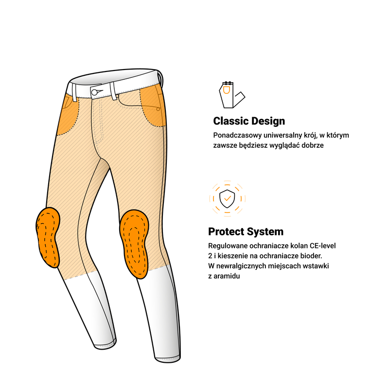 • aramidowe panele wszyte wewnątrz na kolanach, biodrach i w pasie