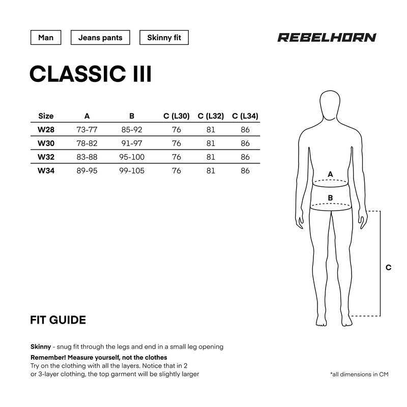 Jeansy motocyklowe Rebelhorn Classic III mają klasyczny wygląd i na pierwszy rzut oka nie wyglądają na spodnie motocyklowe. Zastosowanie elastanu w tkaninie zapewnia swobodę ruchów zarówno podczas jazdy, jak i po zejściu z motocykla. Spodnie Rebelhorn Classic III zostały wzmocnione aramidową podszewką i potrójnymi szwami, dzięki czemu są bardzo wytrzymałe na tarcie. Jeansy motocyklowe Rebelhorn Classic III są dostępne w trzech krojach – regular, slim i skinny.