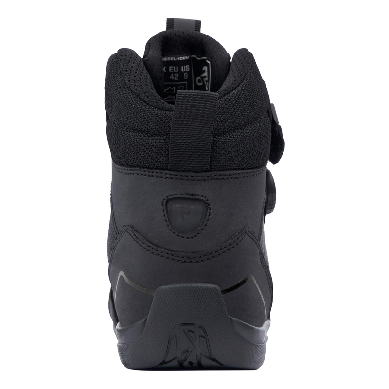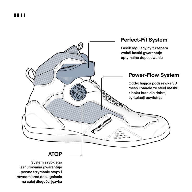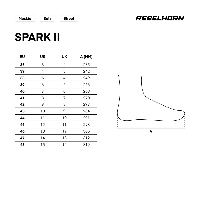 Rebelhorn Spark II to krótkie, miejskie buty motocyklowe ze sportowym charakterem. Mają system szybkiej regulacji i sznurowania ATOP. Ochronę w butach Spark II zapewniają certyfikowane ochraniacze kostek i wzmocnienia na czubku buta oraz pod dźwignię zmiany biegów. Buty wyposażono w oddychającą wyściółkę 3D mesh i panele steel mesh.