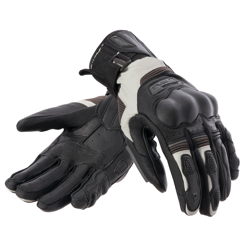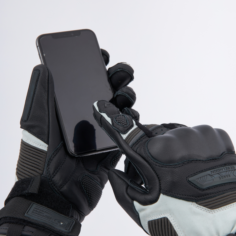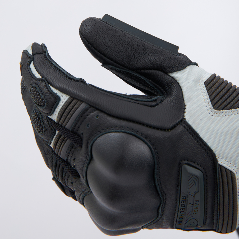 Turystyczne rękawice motocyklowe Rebelhorn Range mają miękkie ochraniacze kostek SAS-TEC® i wstawki absorbujące siłę uderzenia na wewnętrznej stronie dłoni i mankiecie. Spód rękawicy wzmocniono materiałem Superfabric® i dodatkową warstwą skóry chroniącą przed przetarciem. Wycieraczka umieszczona na kciuku poprawia komfort podroży podczas deszczu. Rękawice Rebelhorn Range są przystosowane do obsługi ekranów dotykowych.