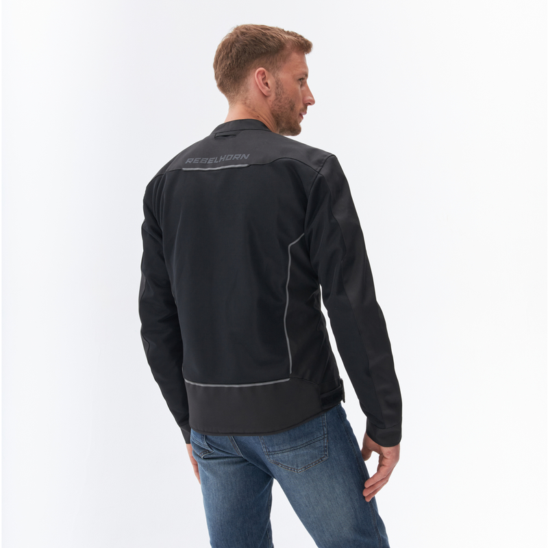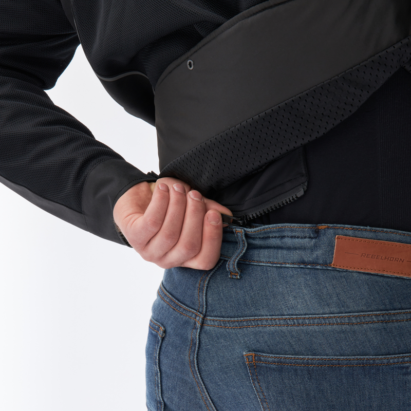 Kurtkę można spiąć ze wszystkimi spodniami tekstylnymi Rebelhorn przy pomocy zamka łączącego. Zamek umożliwia także spięcie kurtki z jeansami z nowej kolekcji Rebelhorn.
