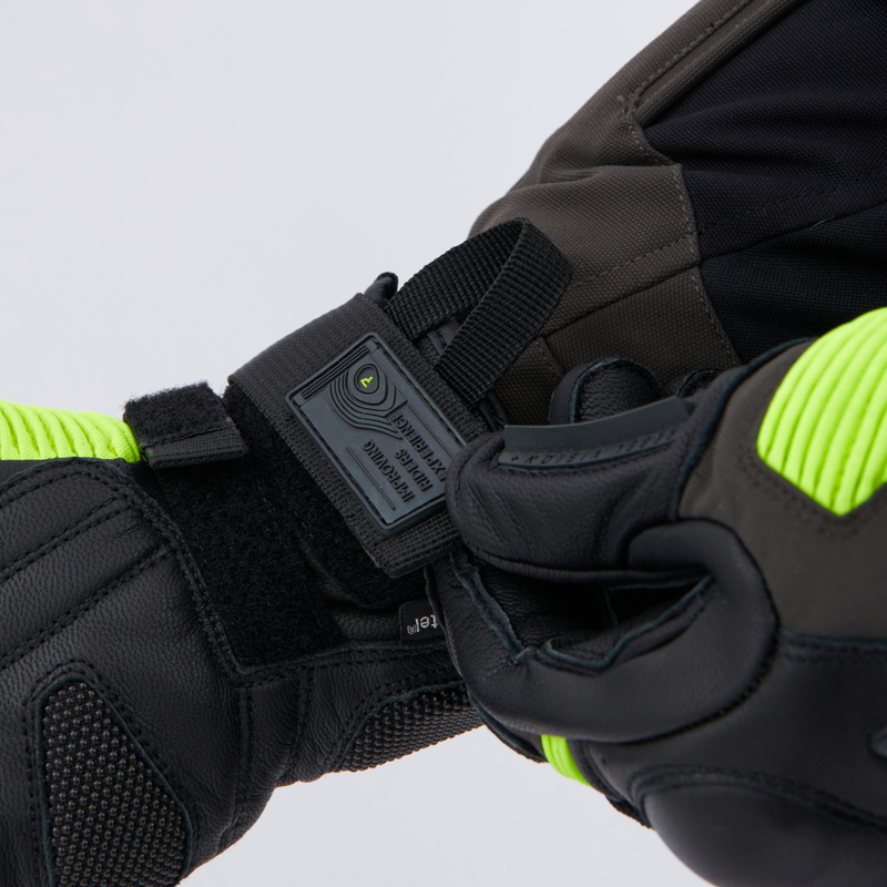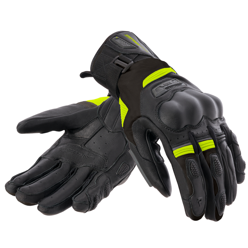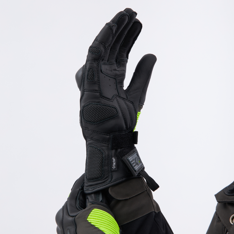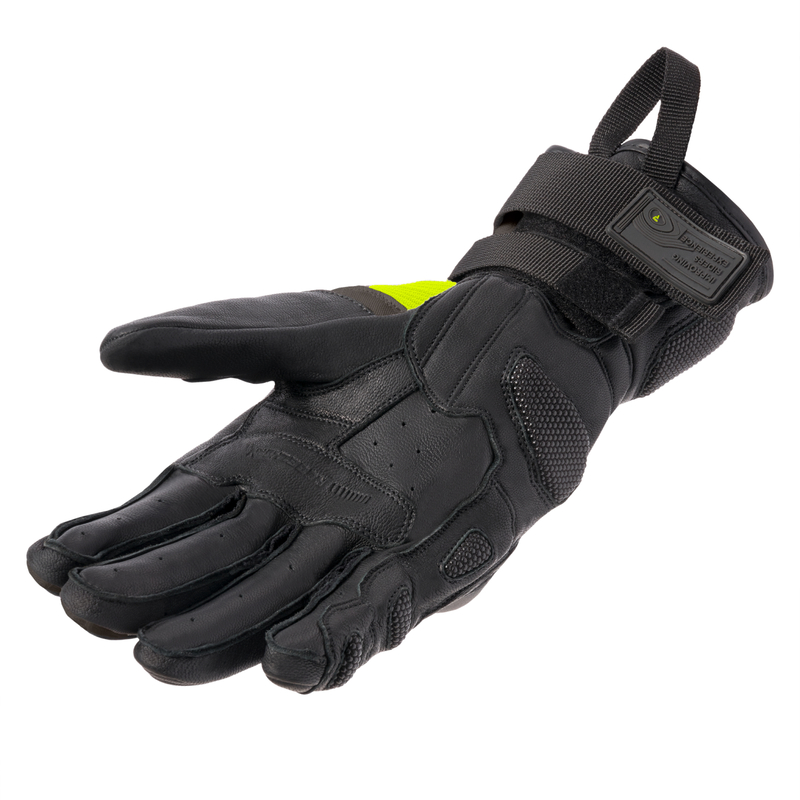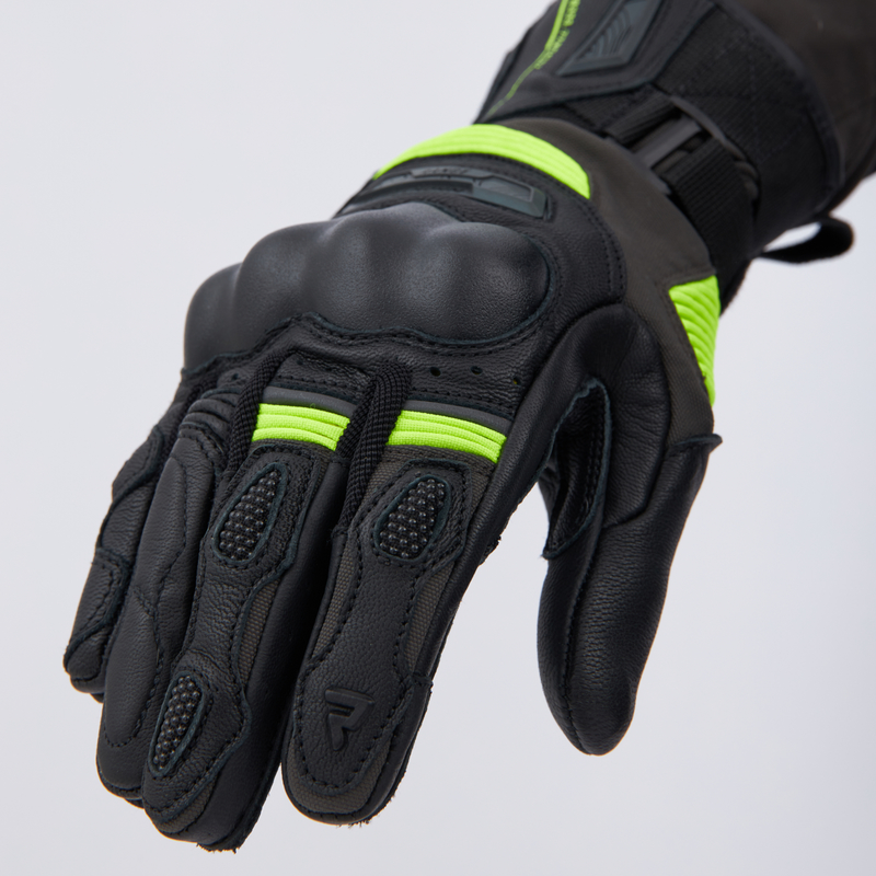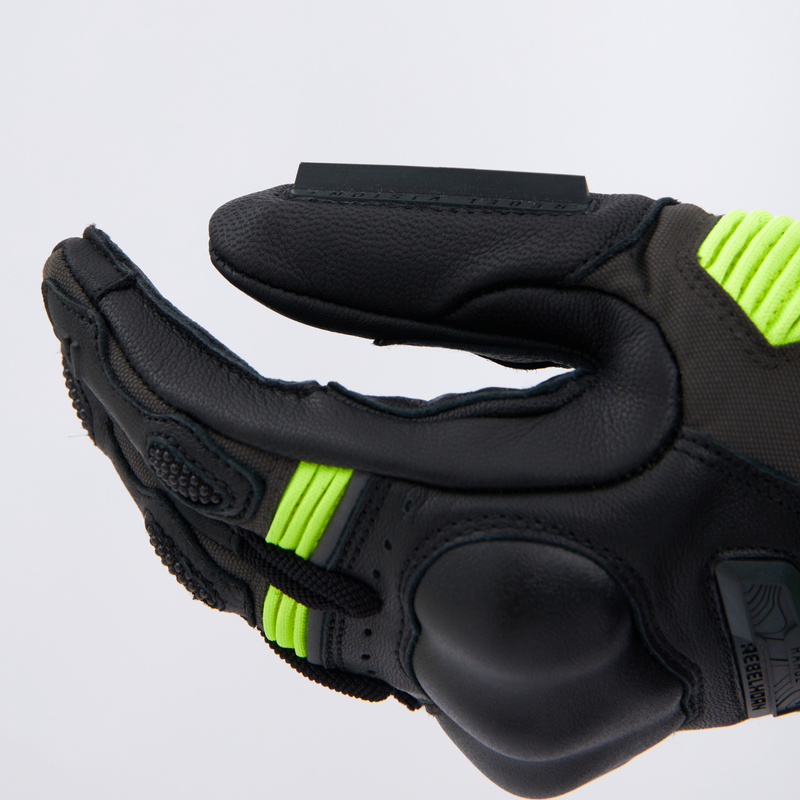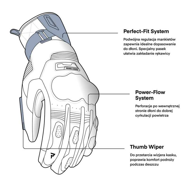 Turystyczne rękawice motocyklowe Rebelhorn Range mają miękkie ochraniacze kostek SAS-TEC® i wstawki absorbujące siłę uderzenia na wewnętrznej stronie dłoni i mankiecie. Spód rękawicy wzmocniono materiałem Superfabric® i dodatkową warstwą skóry chroniącą przed przetarciem. Wycieraczka umieszczona na kciuku poprawia komfort podroży podczas deszczu. Rękawice Rebelhorn Range są przystosowane do obsługi ekranów dotykowych.
