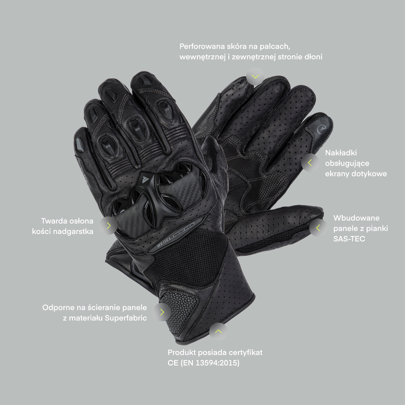 Rebelhorn Flux II to krótkie, miejskie rękawice o sportowym charakterze. Dzięki licznym perforacjom zarówno na wierzchu, jak i po wewnętrznej stronie dłoni zapewniają komfort termiczny nawet w upalne dni. Bezpieczeństwo wspierają wzmocnienia z materiału Superfabric®, twarde osłony kostek i panele z pianki SAS-TEC®.