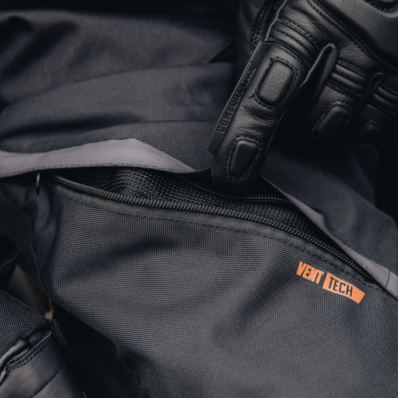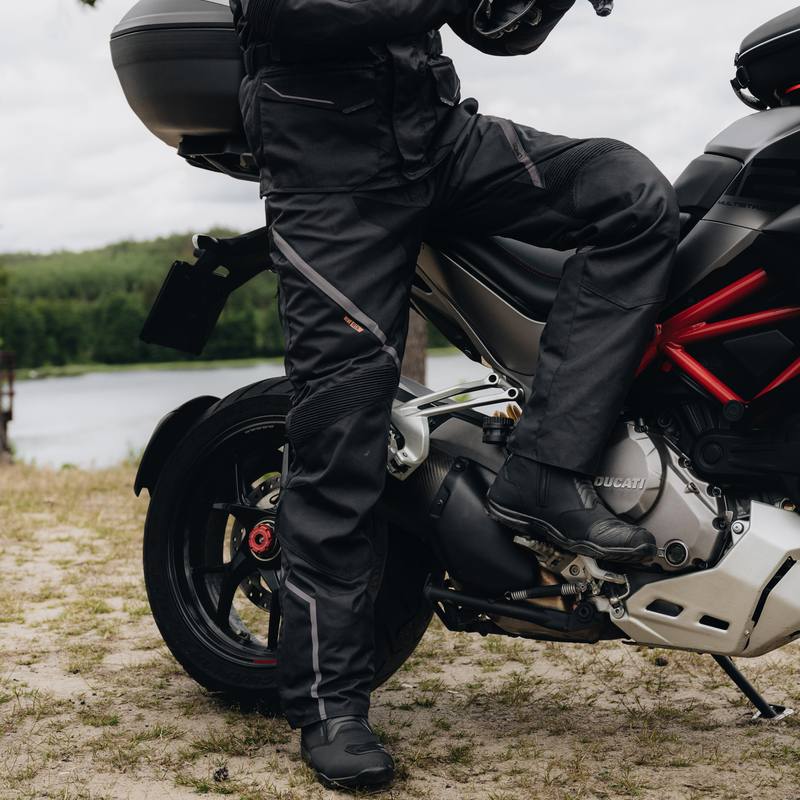 Motocyklowe spodnie męskie Union z elastycznymi wstawkami nad kolanami. Mają system rozbudowanej wentylacji z dwoma kanałami przepływu powietrza. Wyposażone w wypinaną membranę i ochraniacze kolan z regulacją wysokości. Posiadają elementy odblaskowe i kieszenie na ochraniacze na biodrach. MATERIAŁ