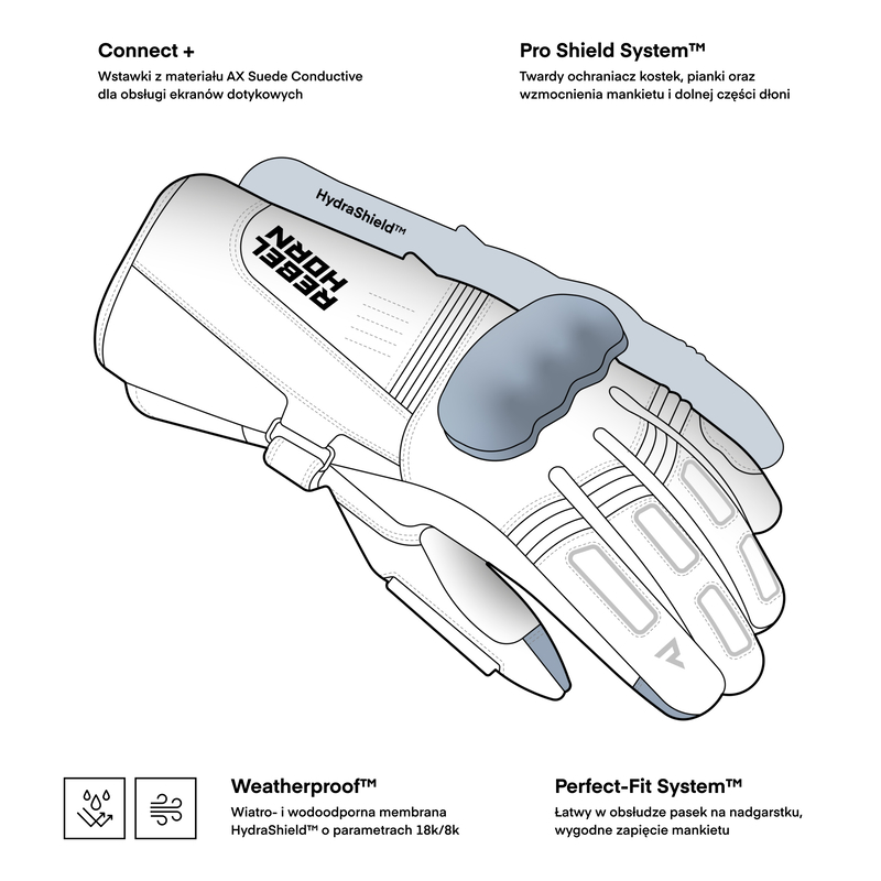 Wodoodporne rękawice motocyklowe Rebelhorn Tracer WP są przeznaczone dla miłośników turystyki motocyklowej, poszukujących lekkich i funkcjonalnych akcesoriów. Posiadają ergonomicznie zaprojektowaną wycieraczkę wizjera, która wraz z wodoodporną membraną HydraShieldTM zapewnia komfort jazdy w deszczowych warunkach. Za bezpieczeństwo odpowiadają twarde ochraniacze kostek oraz pianki i wzmocnienia na dłoni oraz na mankietach. Dodatkowo, rękawice Tracer WP zostały wyposażone we wstawki ze skóry AX Conductive, dzięki której idealnie nadają się do obsługi urządzeń dotykowych, zapewniając wygodę i funkcjonalność w każdych warunkach.