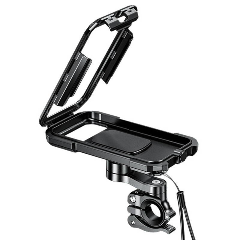 Uchwyt z zaciskiem na kierownicę, wyposażony w wodoodporne etui z ramką przewodzącą dotyk do telefonów.