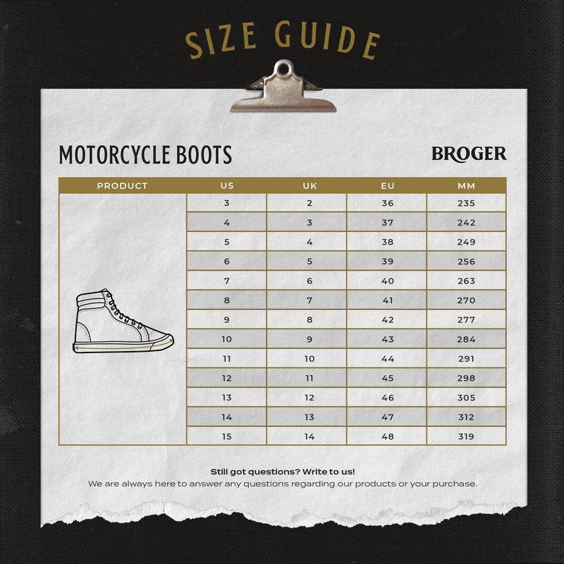 BROGER – BUTY DLA CIEBIEJeśli więc żyjesz chwilą, uwielbiasz spędzać czas na świeżym powietrzu i czerpać z życia 100% - buty motocyklowe California będą idealne dla Ciebie. Nadążą za Twoim szybkim tempem i będą świetnym uzupełnieniem Twojego looku – niezależnie od tego czy wylądujesz na plaży, w kawiarni czy po prostu – w pracy.Niezwykła podeszwaPodeszwa w butach California dzięki zintegrowanej wstawce jest wystarczająco twarda i sztywna, by zapewnić bezpieczeństwo na motocyklu, jednak nie na tyle, żeby przeszkodzić nam w chodzeniu w tych butach na co dzień. Doskonale absorbuje drgania wynikające z jazdy motocyklem. Perforowana wkładka z naturalnej skóry odpowiada za świetną wentylację.Certyfikacja CECertyfikacja produktów to długi i żmudny proces. Wymaga on spełnienia wielu wytycznych narzucanych przez organy certyfikujące, dopracowania absolutnie każdego szczegółu, każdej nici. Wszystkie produkty marki Broger uzyskały certyfikację co oznacza, że są wystarczające bezpieczne, by bez wahania jeździć w nich na motocyklu. Tabela Rozmiarów