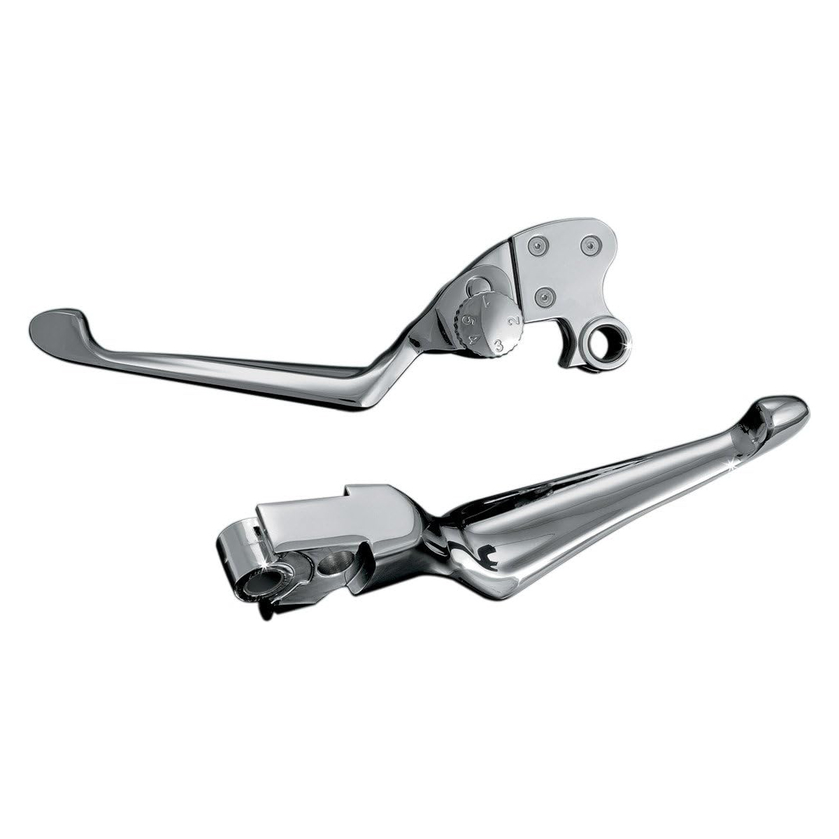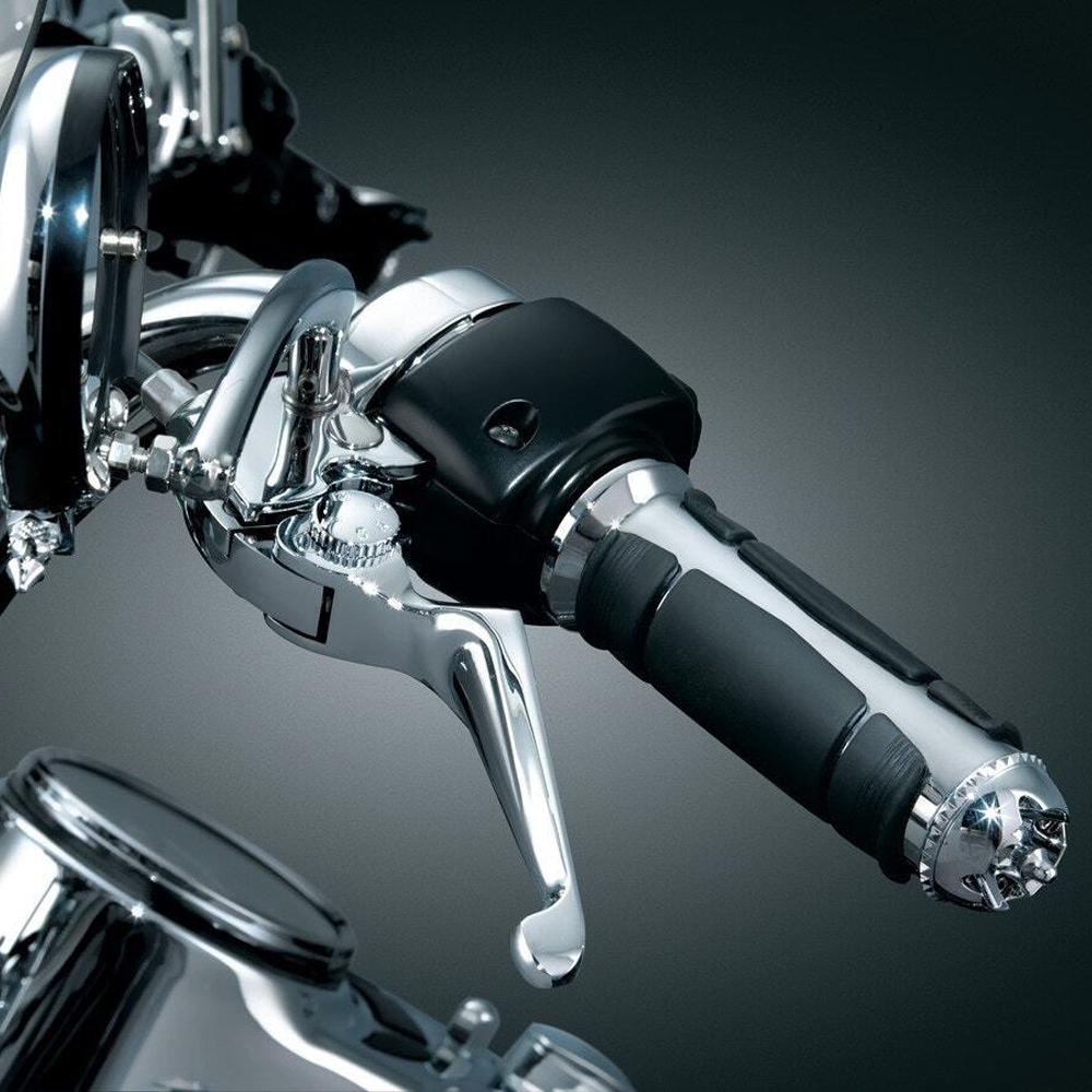 Chromowane dźwignie sprzęgła i hamulca Kuryakyn Boss Blades, zaprojektowane z myślą o motocyklistach ceniących zarówno styl, jak i funkcjonalność. Te eleganckie klamki wyróżniają się szerokim, głęboko wyprofilowanym kształtem, który zapewnia pewny chwyt oraz komfortową obsługę. Regulowana dźwignia sprzęgła umożliwia dostosowanie jej położenia do indywidualnych preferencji, podczas gdy dźwignia hamulca pozostaje w stałej pozycji, gwarantując precyzyjne hamowanie.